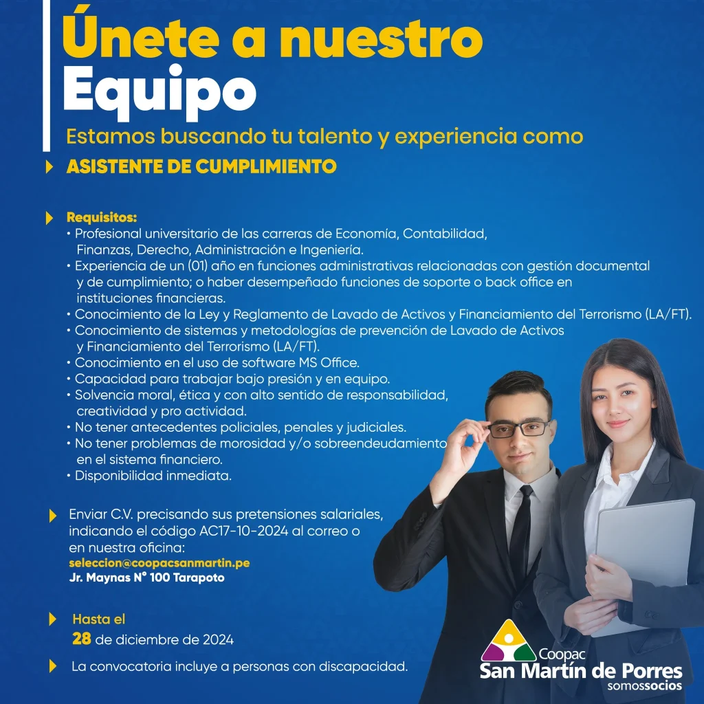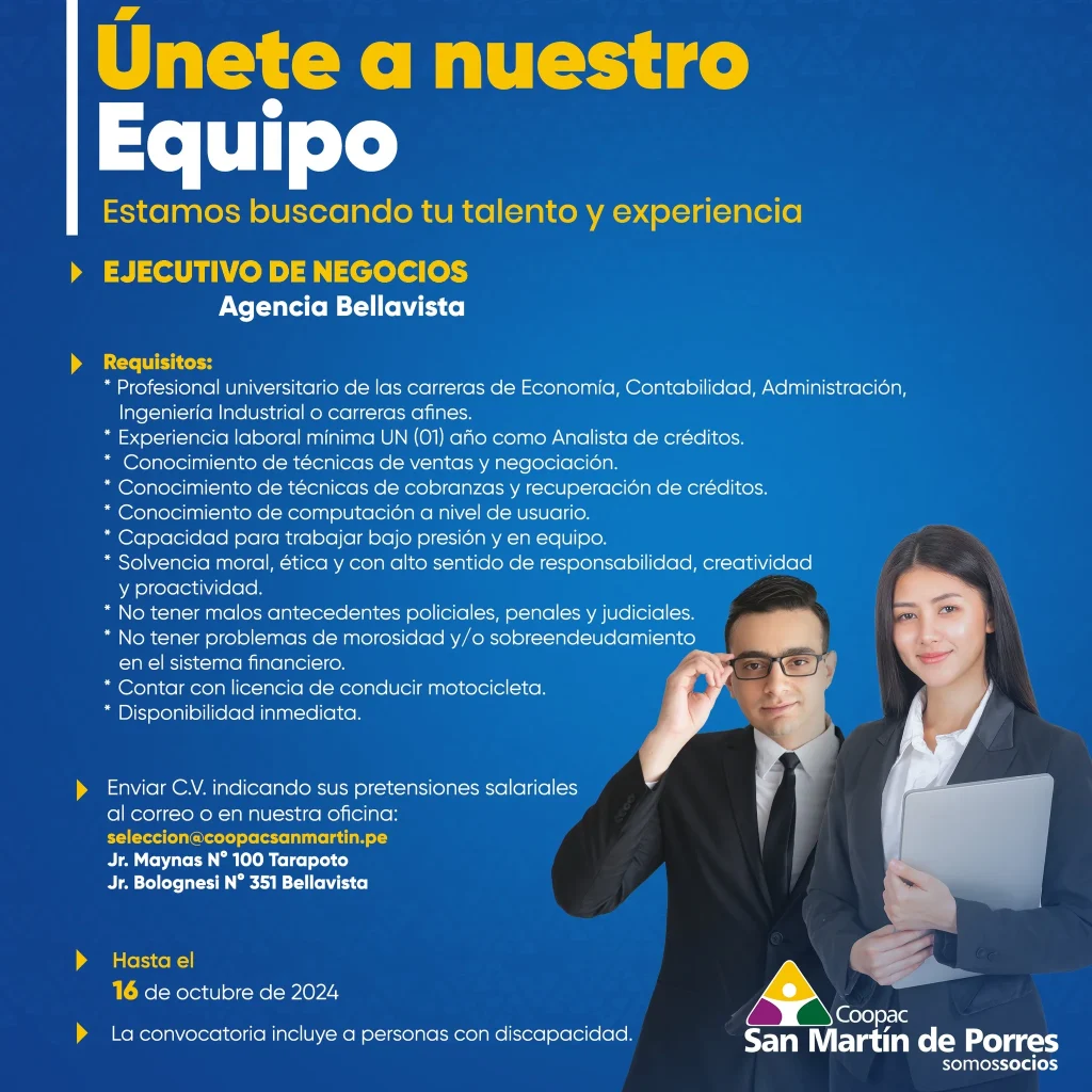 ¡Únete a nuestro equipo en la Coopac San Martín y forma parte de una institución sólida y en constante crecimiento!