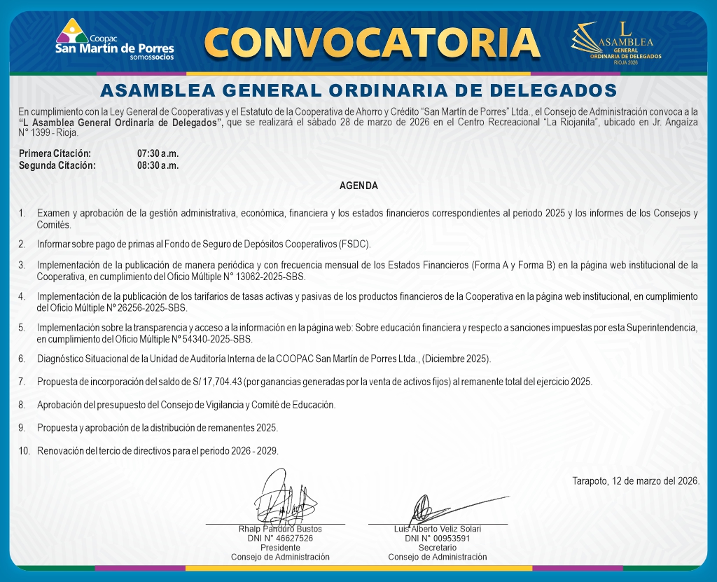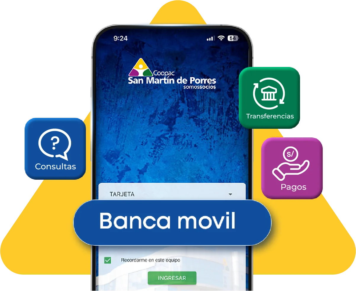Ahorra a tu ritmo, sin límitesDisfruta la flexibilidad de ahorrar según tus posibilidades y metas personales.Conoce más Pide tu crédito con confianzaAccede a créditos flexibles y confiables diseñados para impulsar tus planes.Solicitar CréditoIngrese seguro a Socio en Línea En Coopac San Martín de Porres te ayudamos a alcanzar tus objetivos personales o empresarialesBanca Móvil