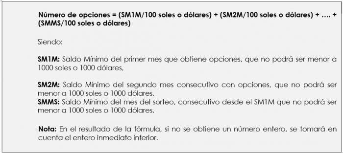 De acuerdo a los movimientos efectuados en este ejemplo, la cuenta participará del sorteo del 19 de julio del 2025, sin embargo, para participar del sorteo del 17 enero del 2026, en los meses desde julio del 2025 hasta enero 2026 (16 de enero), la cuenta no deberá haber reportado saldos menores a 1000 soles, cumplida esta condición, para este último sorteo, se agregarán a las opciones obtenidas desde enero 2025 hasta junio 2025, el recalculo de las opciones de julio 2025 (mes completo) y se agregarían las opciones que generen los saldos mínimos de cada uno de los meses desde agosto 2025 a enero 2026 (hasta el 16 de enero).