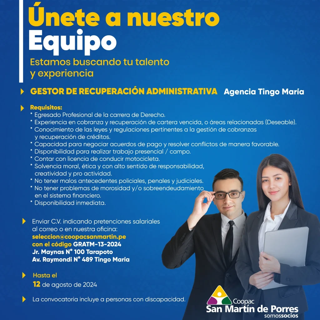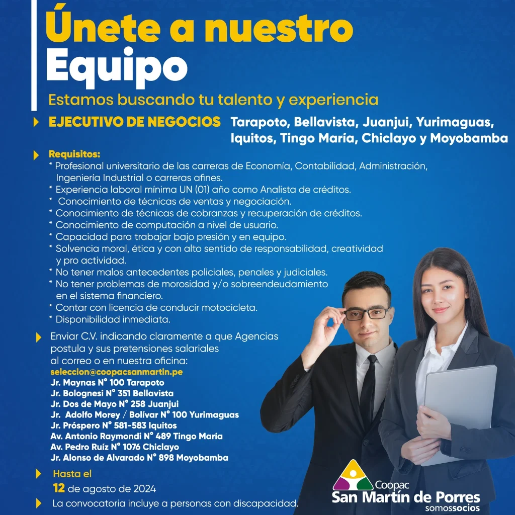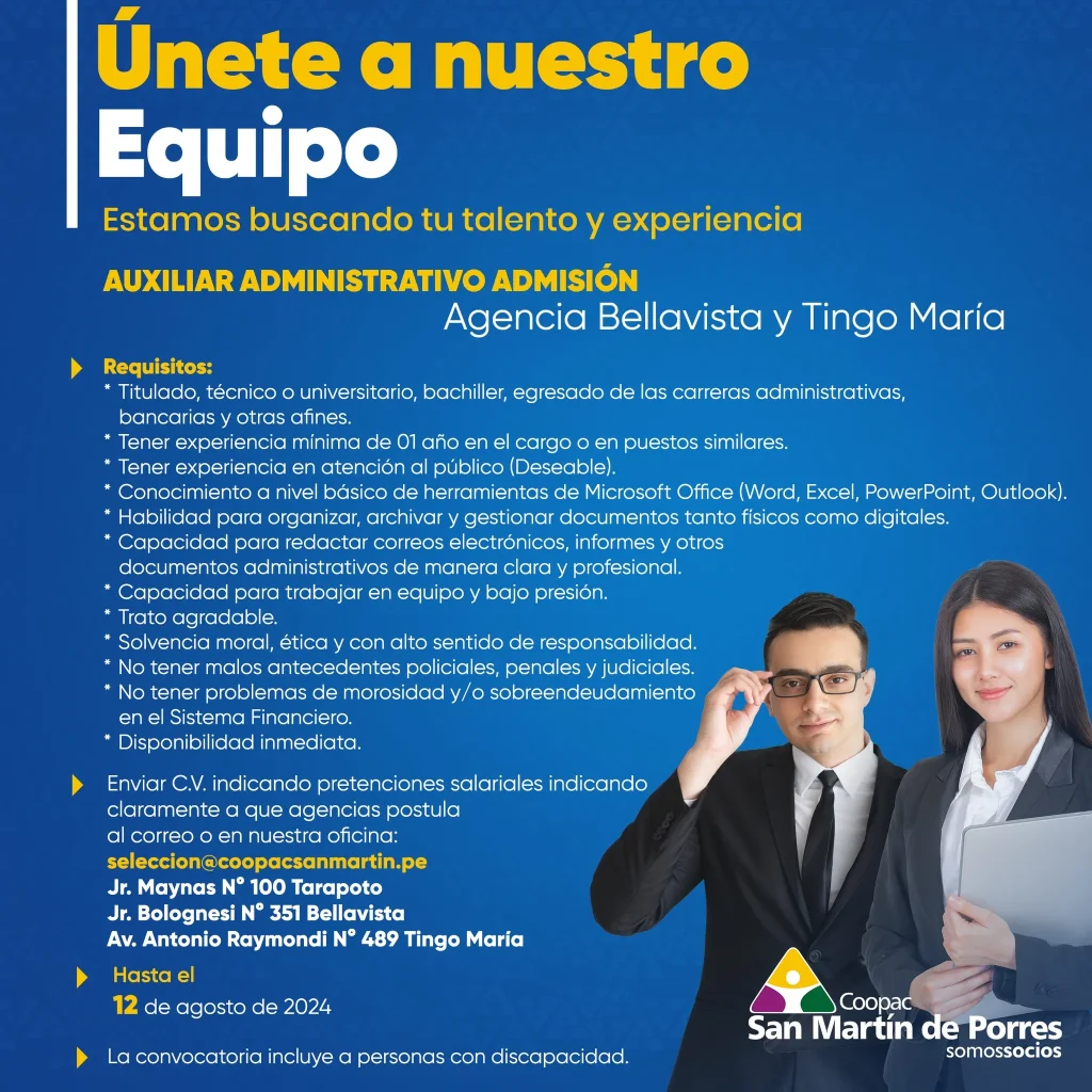 ¡Únete a nuestro equipo en la Coopac San Martín y forma parte de una institución sólida y en constante crecimiento!